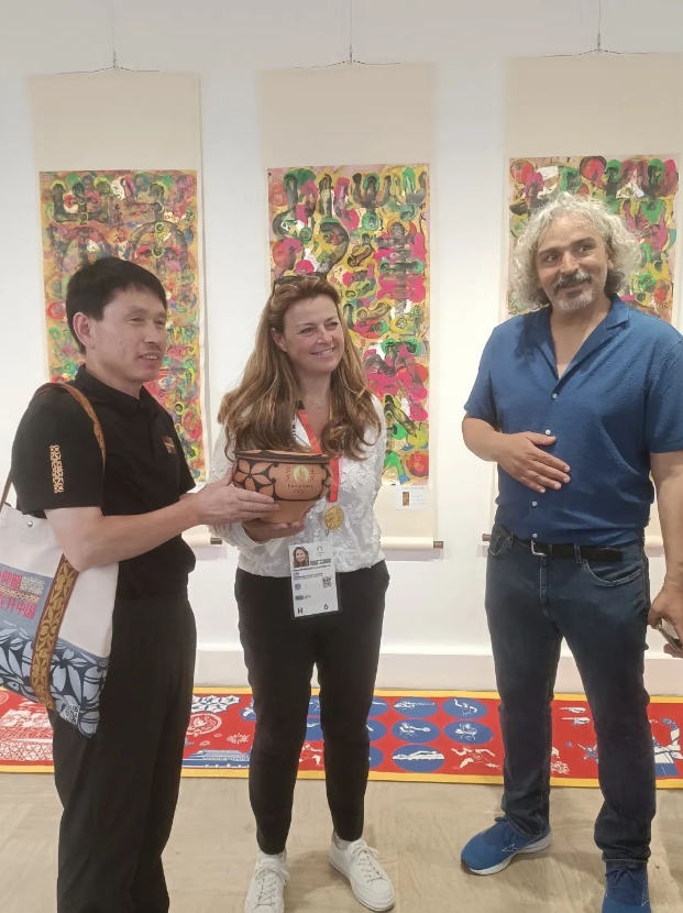 7月25日,在法國巴黎,來自三門峽市的王新軍(左)與現(xiàn)代奧林匹克運(yùn)動會之父顧拜旦的曾孫女黛安·德·納瓦塞爾·德·顧拜旦夫人(中)進(jìn)行文化交流。王新軍作為仰韶彩陶制作技藝的領(lǐng)軍人物,他精心制作了“花開奧運(yùn)”經(jīng)典彩陶盆與廟底溝花瓣紋彩陶盆,參加此次巴黎奧運(yùn)文化體育交流活動。