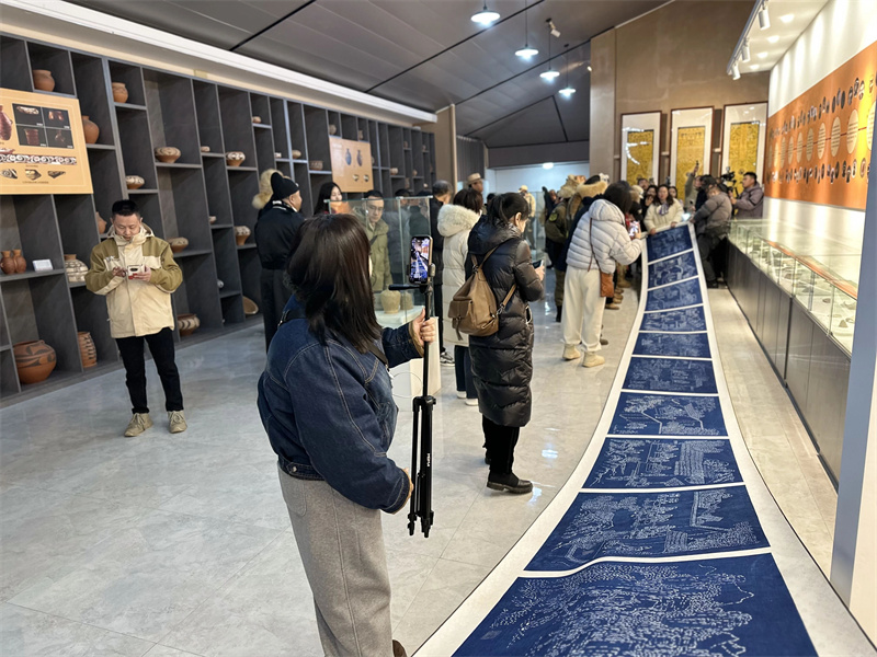 步入彩陶館,駱駝隊隊員們被仰韶文化的厚重底蘊深深吸引。在公司董事長暨三門峽市仰韶文化非遺傳承人王新軍的引領下,他們凝視著館藏彩陶上那些流轉(zhuǎn)千年的紋樣,手撫仿制陶器,驚嘆于七千年前仰韶先民已經(jīng)掌握礦物顏料繪制、高溫燒制的精湛工藝,也被結(jié)合三門峽特色非遺板藍根印染技藝的十米仰韶先民生活圖所震撼。