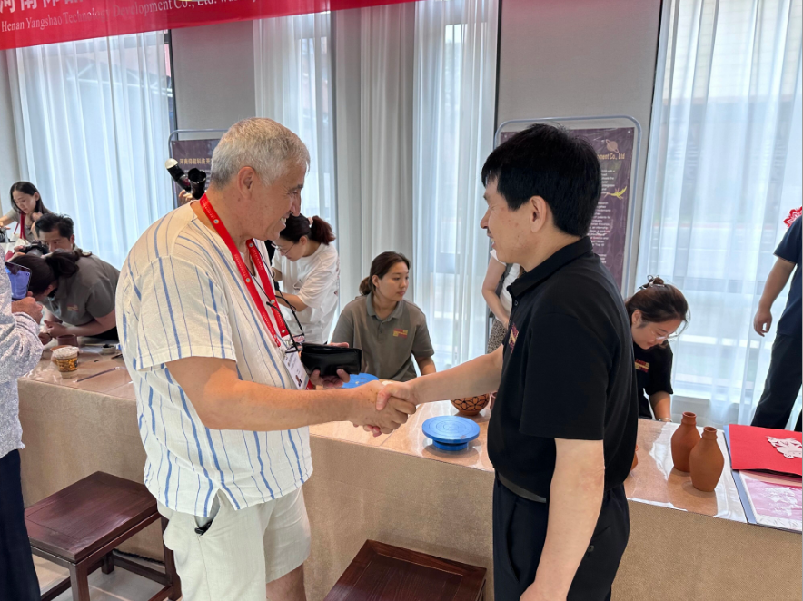 土耳其安卡拉全球咨詢集團(tuán)主席侯賽因.巴哲到河南仰韶科技公司現(xiàn)場體驗(yàn)區(qū)體驗(yàn)彩陶彩繪技藝,對仰韶文化的魅力贊不絕口。